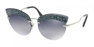Γυαλιά Ηλίου Miu Miu με χρυσό σκελετό και χρυσή μεταλλική μύτη και βραχίονες.Ο φακός του είναι γκρι degrade με στράς στην μετώπη.
